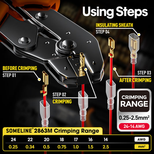 SOMELINE® Wire Terminal Crimping Tool Kit,2.8/3.9/4.8/6.3mm Male Female Disconnect Terminals,with 12 Sizes Wire Connector Set, Crimp Plier 0.25-2.5mm²(AWG 24-14) Non-Insulated Open Barrel Terminals Wire Splices Brass Spade