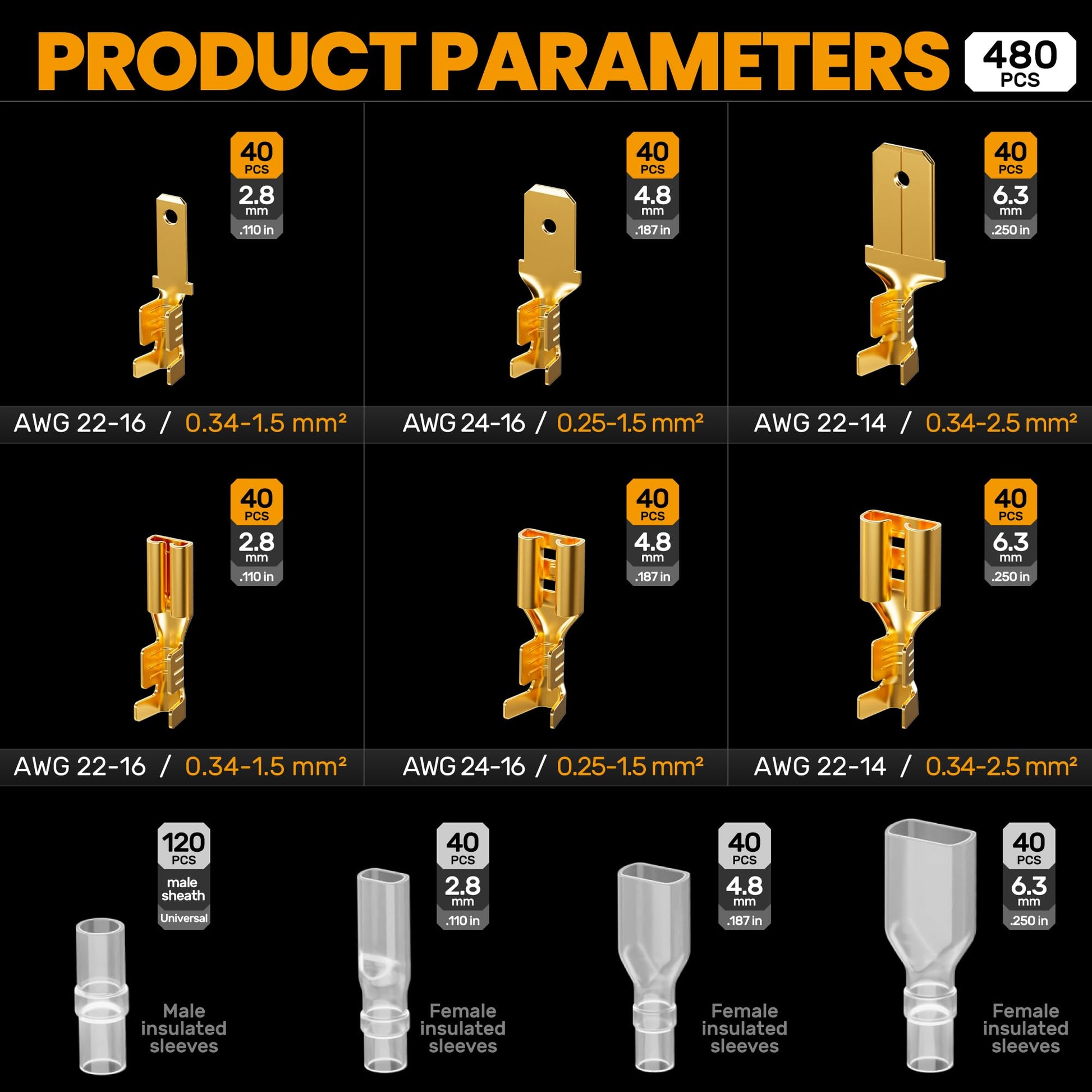 Disconnect Terminals: The terminal block is made of copper, which has high conductivity, oxidation resistance and durability, enough to meet the needs of most DIY projects. 2.8/4.8/6.3mm disconnect terminals for 24-14 AWG cable. A portable storage box is provided for easy storage and sorting of cable terminations