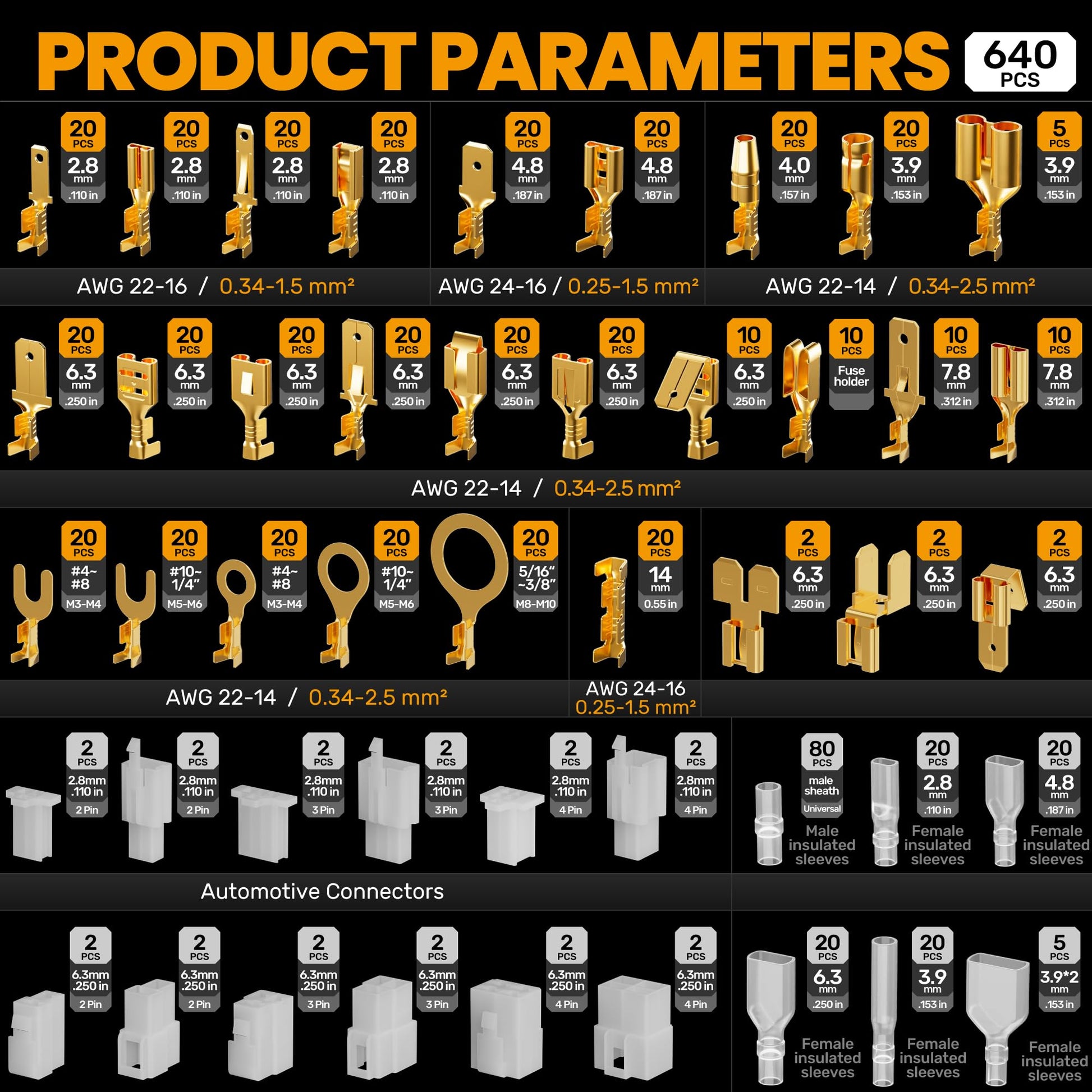 40 Types Connector: including 2.8/4.8/6.3/7.8 mm spade, fork, ring, bullet, butt and quick disconnect terminals, covering the 24-14 AWGwire range. Made of high-quality copper, it has good conductivity, corrosion resistance and oxidation resistance, ensuring stable electrical connection