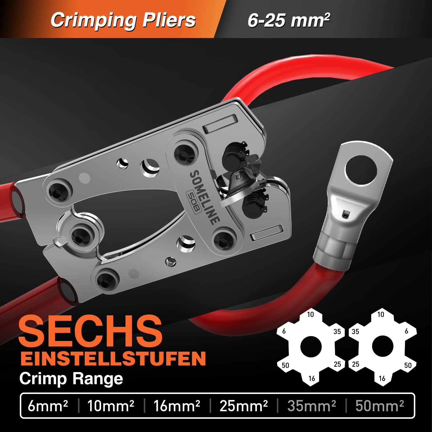 Size: Includes 12 types of cable lug connectors, available in 6 mm², 10 mm², 16 mm², and 25 mm², with connector sizes M6 and M8 to meet all your needs. For crimping the connectors, we recommend the SOMELINE 50T crimping pliers, which provide a perfect crimping service for the connectors you purchase