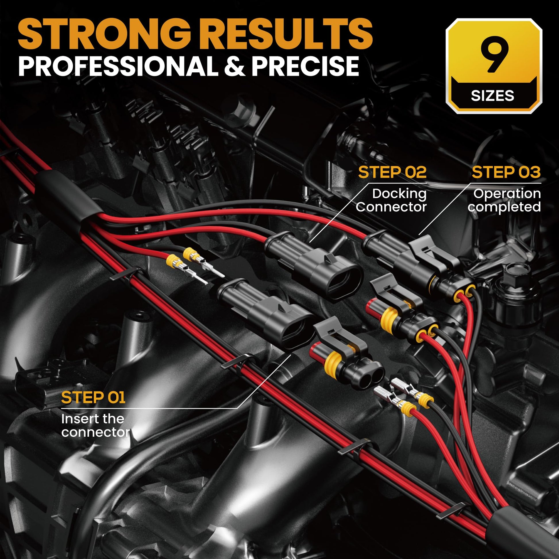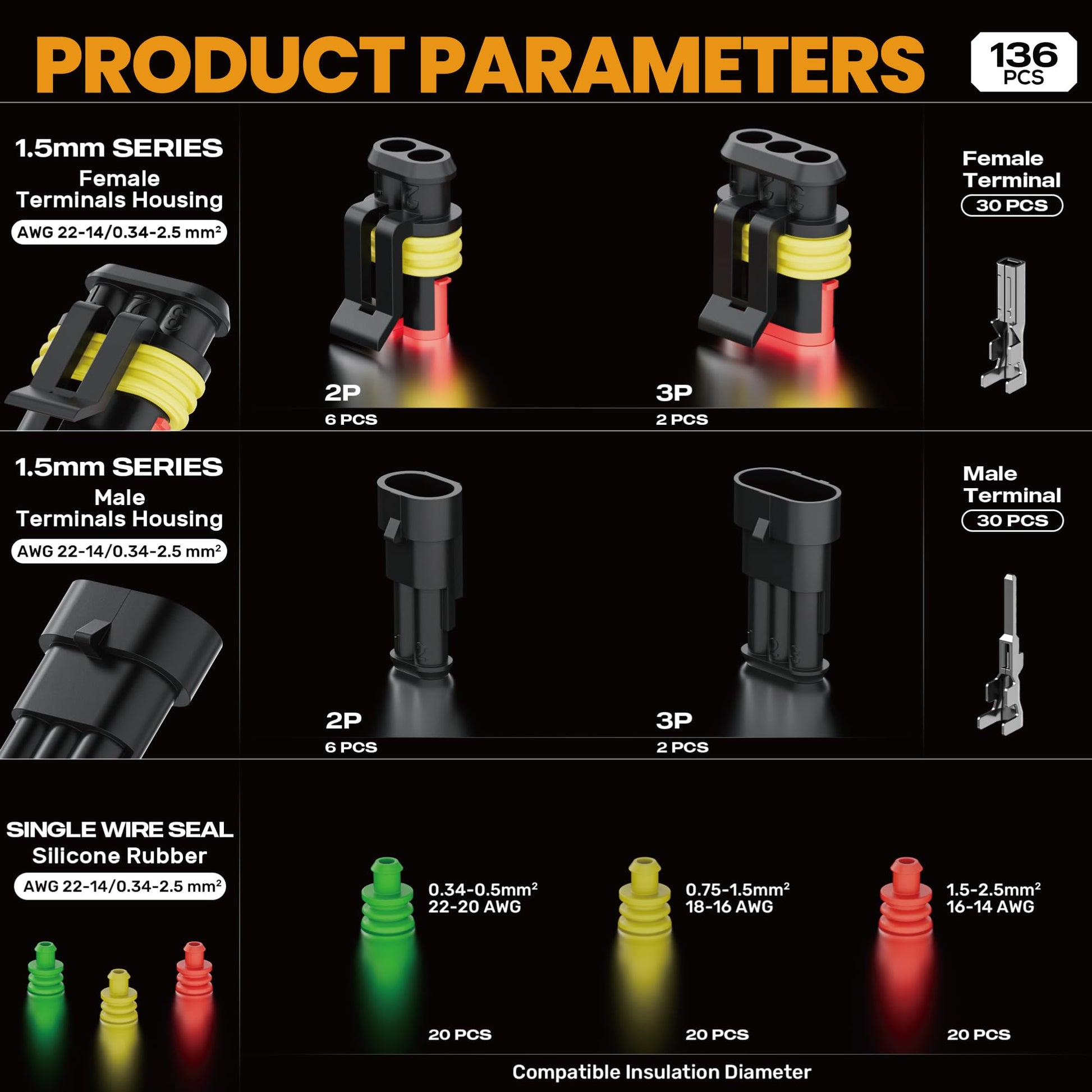 1.5mm Connector Kit: Includes 2-pin and 3-pin sealable wire-to-wire connectors compatible with 22–14 AWG wires. 3 types of silicone single-wire seals for precise insulation: Green: 1.2–1.6 mm, Yellow: 1.7–2.4 mm, Red: 2.5–3.3 mm