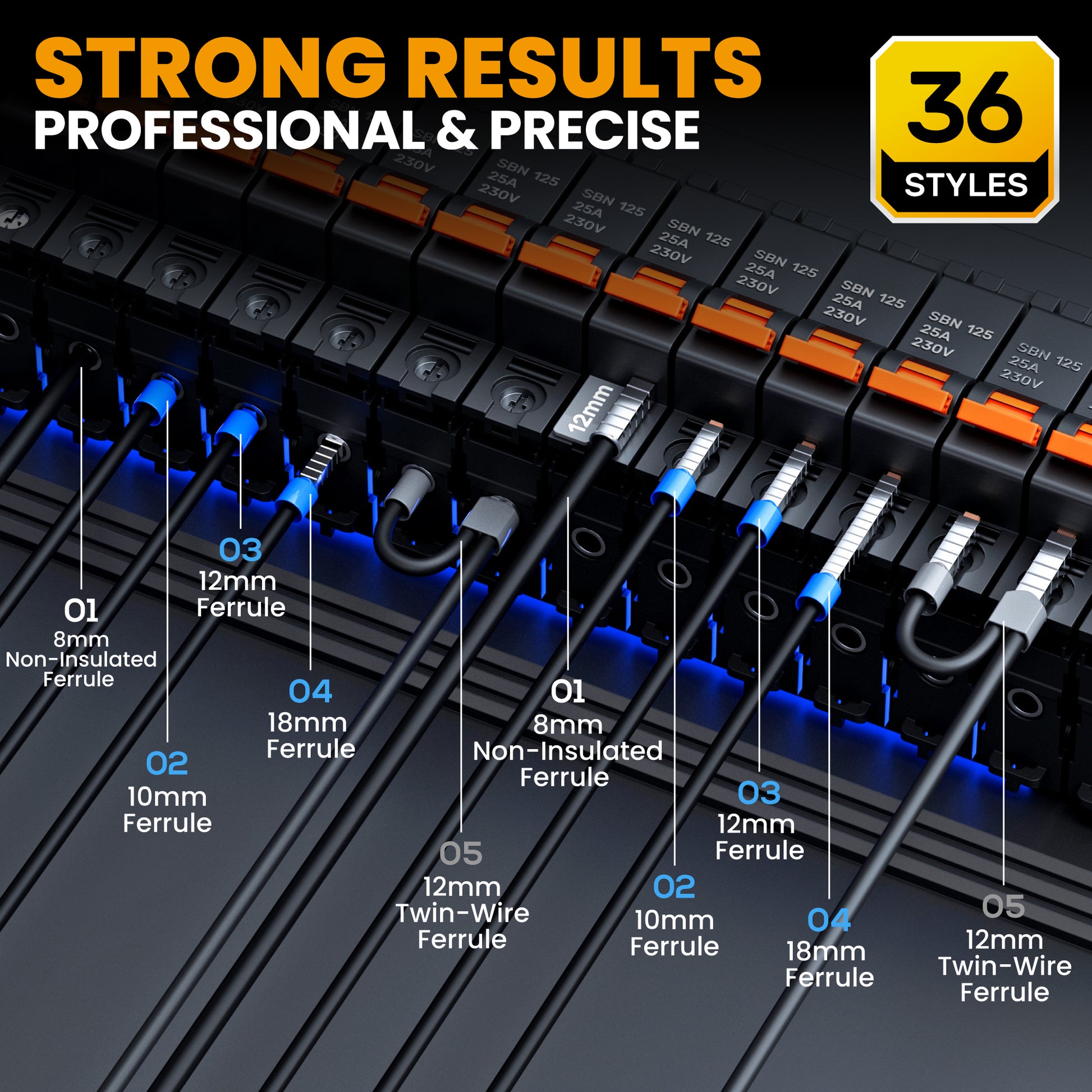 36 Types of Ferrules: 1775 pieces of ferrules for wires ranging from 0.25–10 mm². Includes insulated ferrules, non-insulated ferrules, and twin ferrules