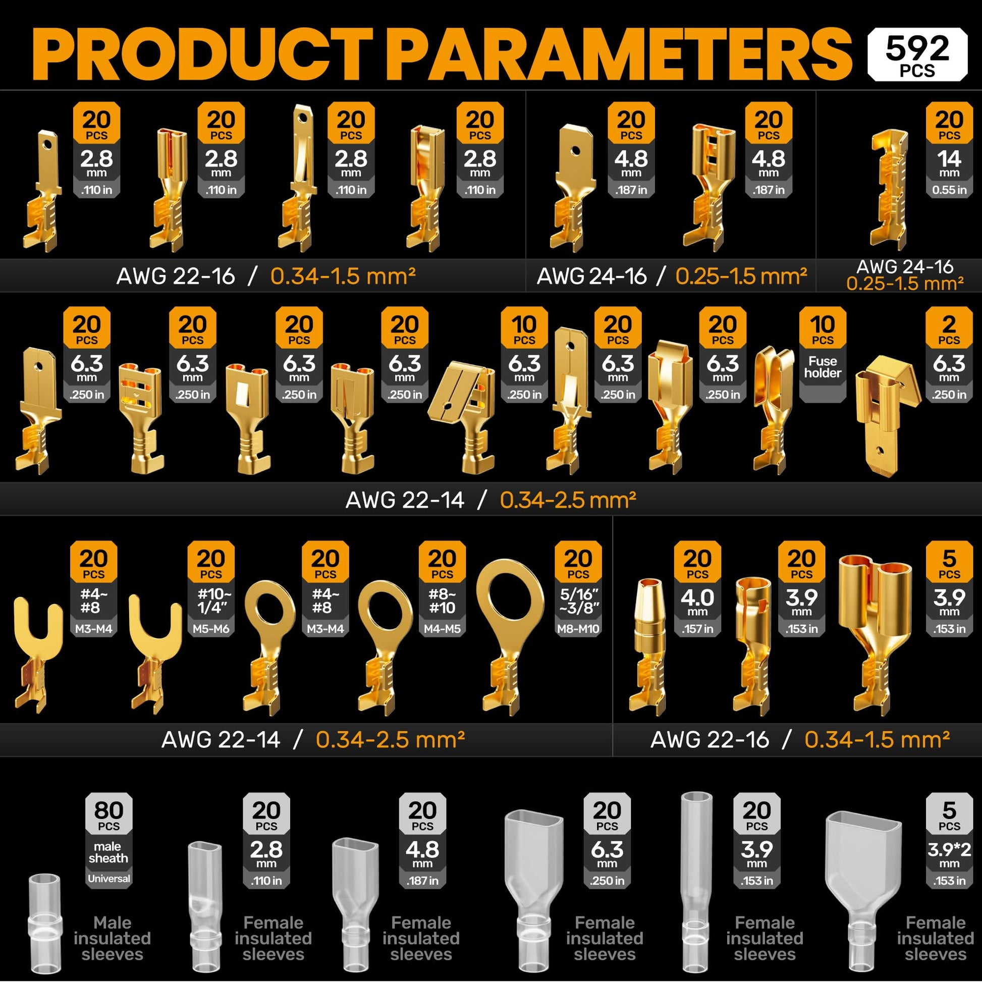 Type and Size: The terminal block is made of copper, which has high conductivity, oxidation resistance and durability, enough to meet the needs of most DIY projects. 24 Sizes wire crimp terminals (TAB 2.8mm, 4.8mm, 6.3mm spade connectors and insulating sleeves) for 24-14 AWG cable. A portable storage box is provided for easy storage and sorting of cable terminations